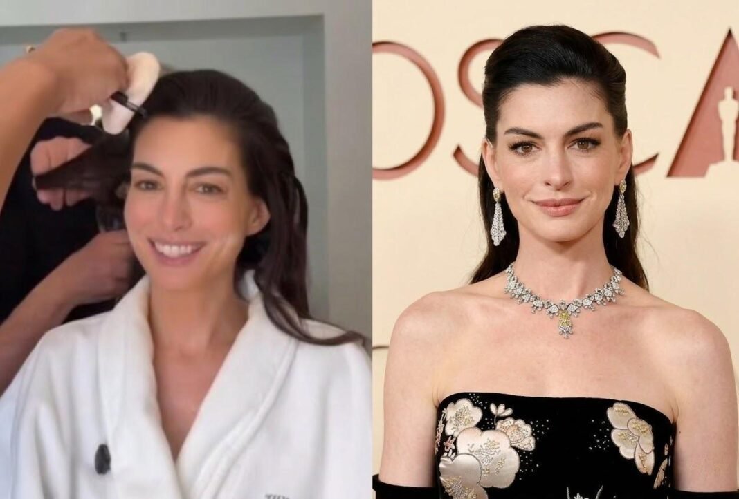 No mesmo vídeo, a protagonista de O Diabo Veste Prada revelou o responsável pelo visual que dividiu opiniões. Hathaway pediu que o cabeleireiro Orlando Pita mostrasse a técnica utilizada.